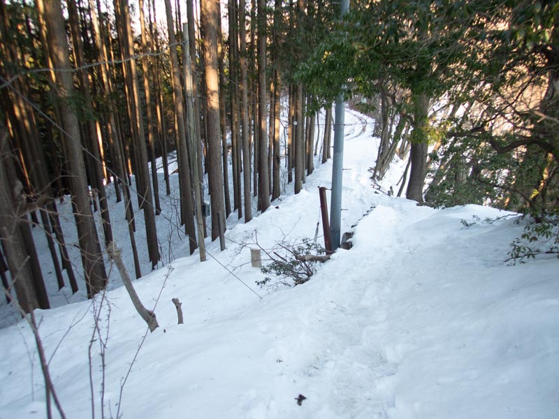 何度か道路に出る。雪もだんだん増えてきて滑る。