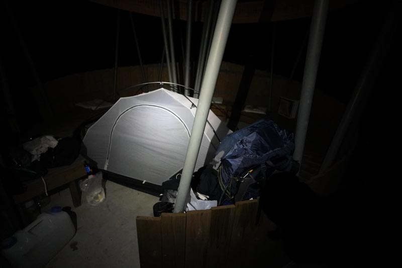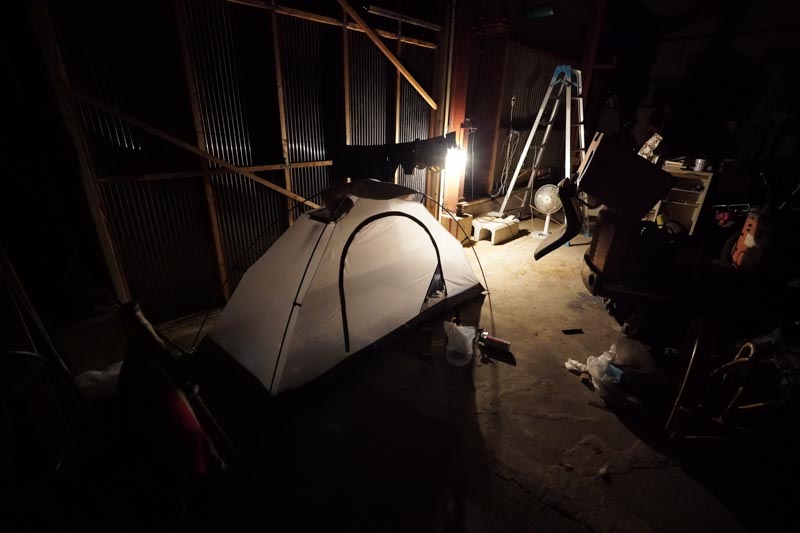 ここはライダーズパラダイスと名前のお店でバイカーが集まる飲食やらいろいろやってるところらしい。まだ歩く気だったが、テント張ってもいいというので、それを聞いた瞬間試合終了したかのように気が抜けてしまい、ここで寝ることにした。雲行きも怪しいので屋根があるガレージの中にテントを張らせてもらった。700円。