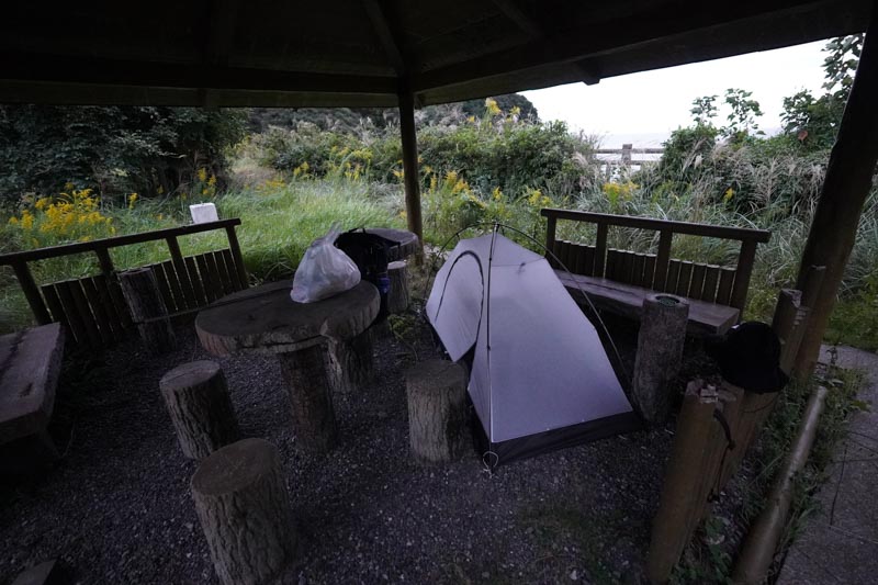 17:40頃、到着。隣の神社に水は・・ない。水探してたら、偶然近所に住んでる人が話しかけてきた。聞きたかった四国の天気について聞いてみた、予報がでたらめなのはいつものことなのか?と。