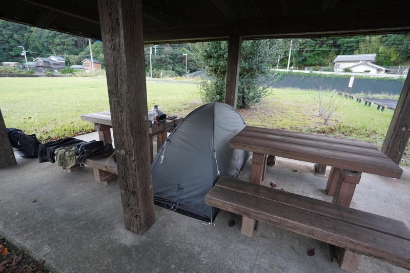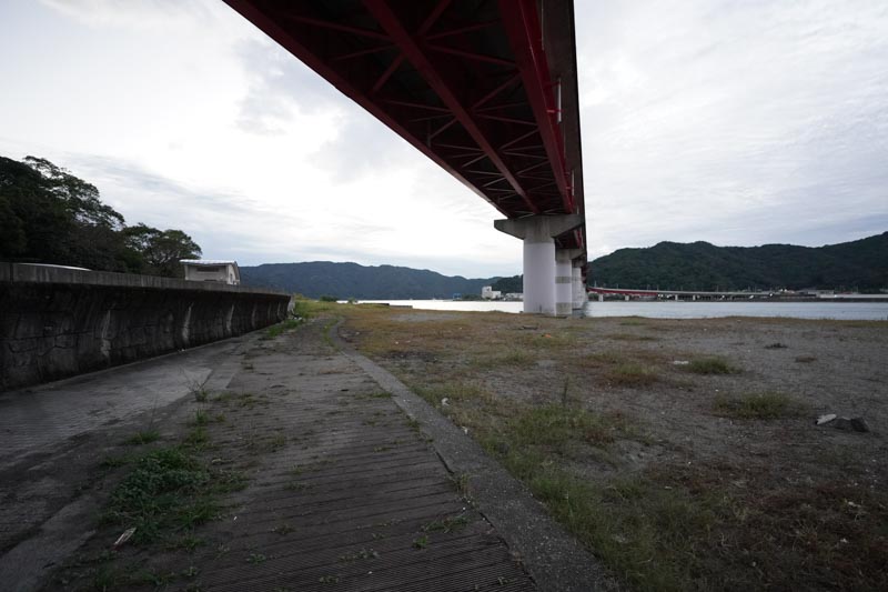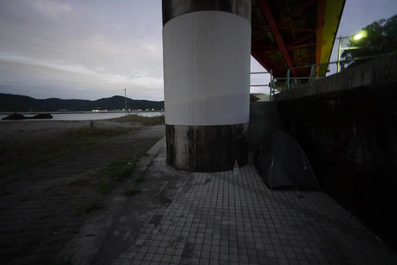 設備的には竜の浜パーキングが一番いいが、人の出入りが多そうなのでこの日は橋の下に行くことにした。橋の下と言ってもビーチっぽくなっている場所で、トイレも水道もある場所。
