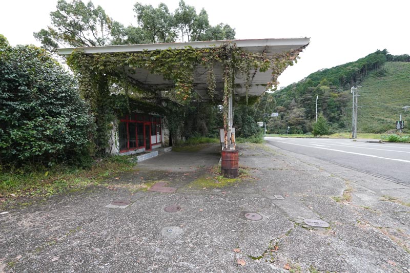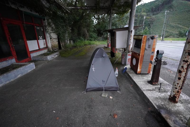 小話をしてるついでに、いいテント場が無いか探ってみたらすぐ隣に廃ガススタがあるからそこ使っていいよという。