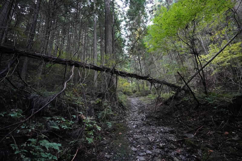 今左の道から出てきたところ。ここが八丁峠(右)との分岐。今朝はここを右に行った。