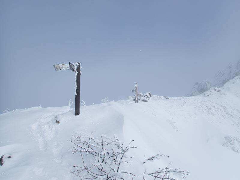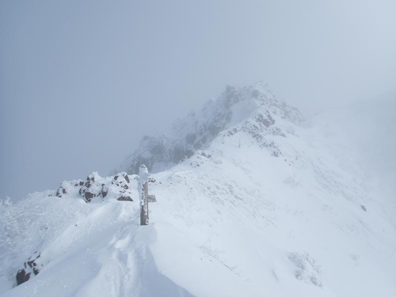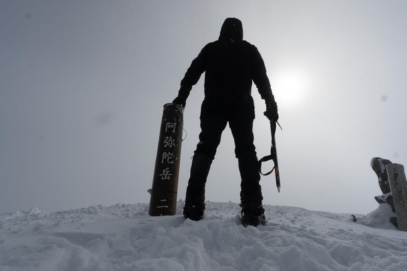 阿弥陀岳山頂到着。見事に真っ白だけど、不思議と風が無いのでまた5分ほど白湯でも飲みながら状況変化を期待した。