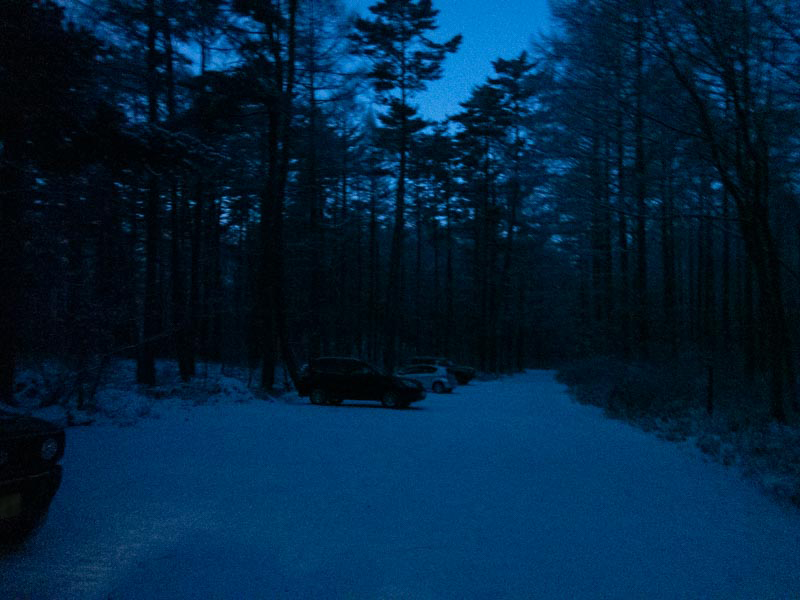 朝5時頃、舟山十字路駐車場到着。484号線から離脱して住宅街からこの細い林道に入るときに雪が結構あったのでここまで来れるか心配だったけど、スタッドレス装備してたので余裕だった。自分以外に3台の車が既にいた。八ヶ岳は連日晴天なので皆さんいい嗅覚をしておられる。