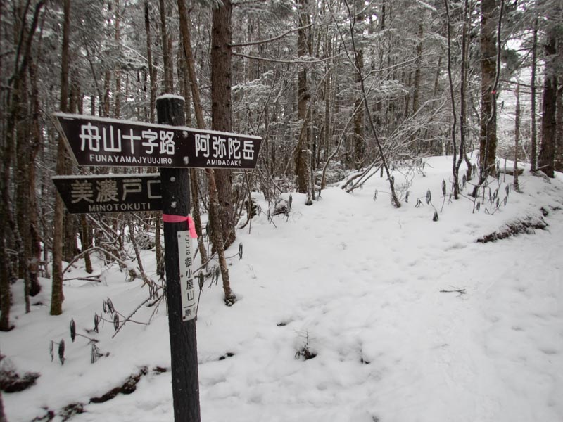 美濃戸口との分岐。ここから少し行ったところでチェーンスパイクの片方が落ちていた。落としたばっかりという感じだったので、同志の一人だろうと持っていってあげることにした。