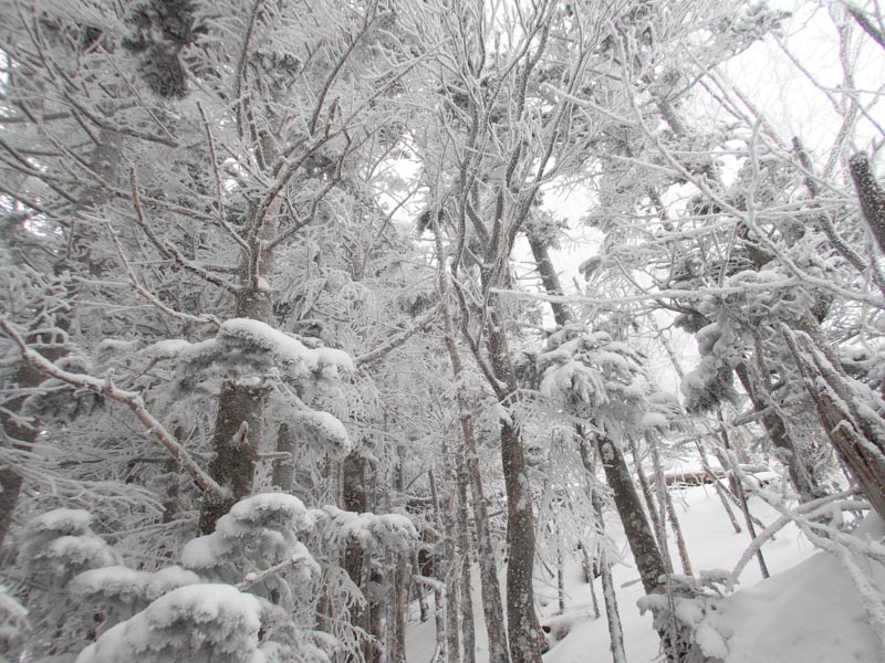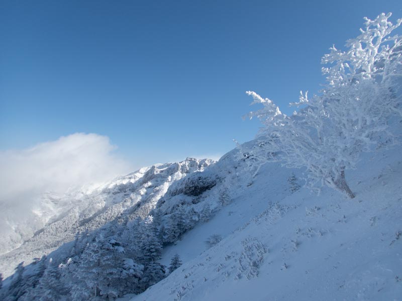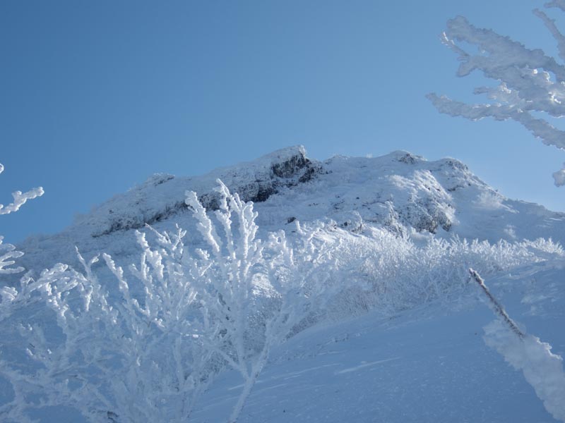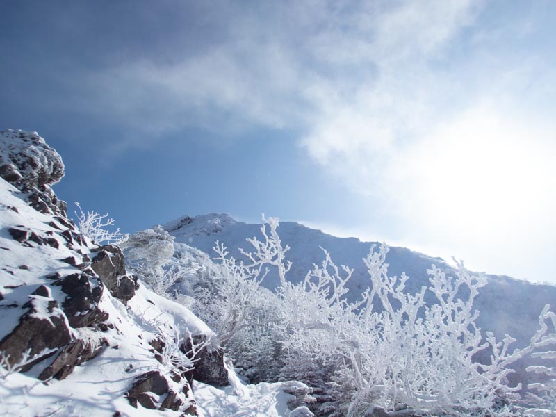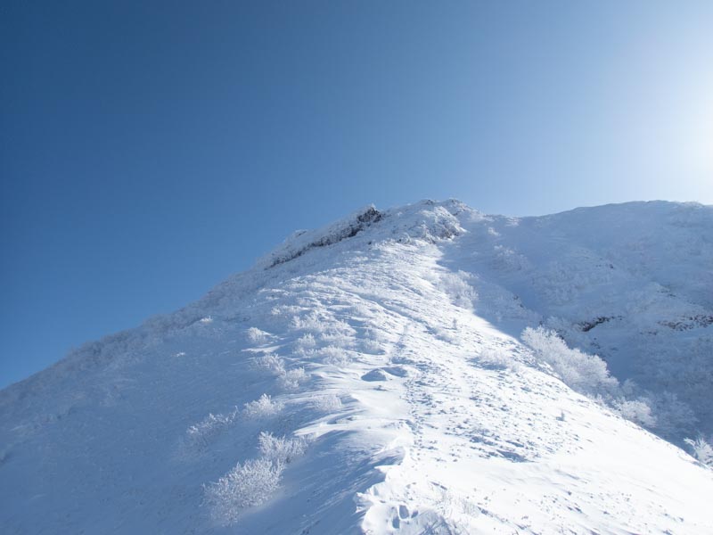 森林限界突破。日の光が強いく、急登で息も上がる、その息がサングラスの内側とバラクラバに張り付いて凍る。